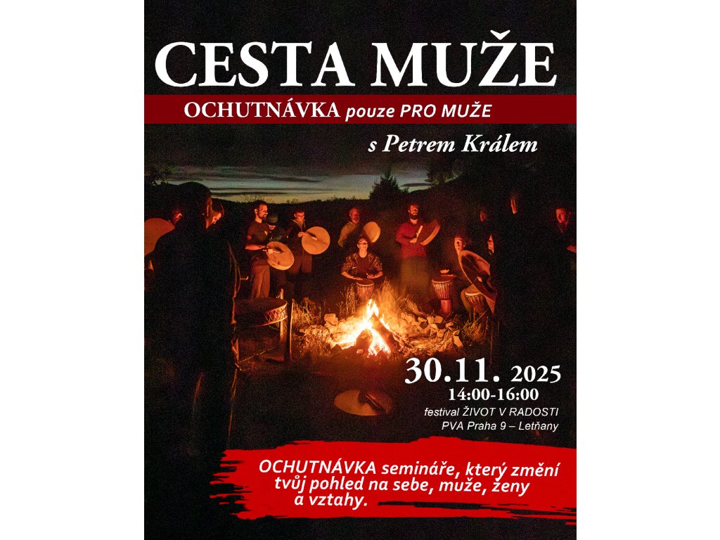 Přijď si zažít atmosféru seminářů Cesta muže s Petrem Králem. Budeš tak mít možnost se na chvíli vydat na cestu s Petrem a prožít v kruhu mužů jeho práci. Ukázka je určena pouze pro muže starších 18.let. Setkání se uskuteční 30.11. od 14:OO do 16:00 na festivalu Život v radosti, (hlavní výstavní hala) výstaviště Letňany, Praha. Pokud máš zájem, nezávazně se registruj.
